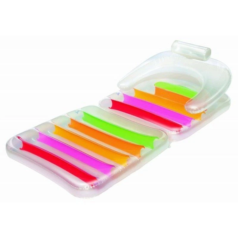 Chaise longue gonflable avec dossier et accoudoirs. Design multicolore et ergonomique, pour une posture confortable. En vinyle résistant et renforcé avec une protection UV. Capacité pour une personne.